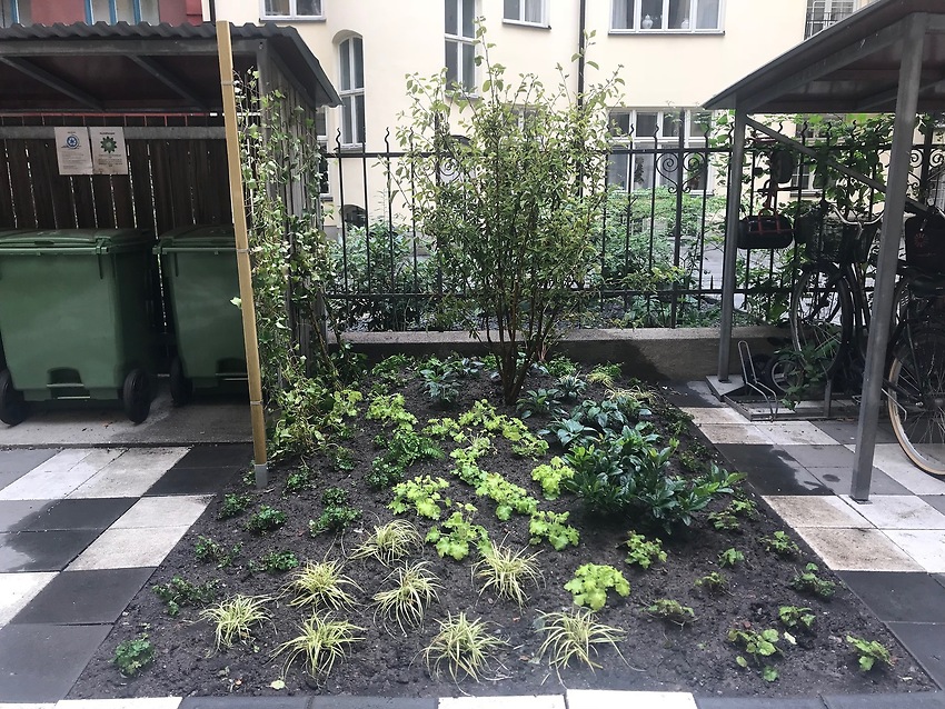 När det växer till sig kommer det att bli lummigt och fint och täcka upp för en del av soptunnorna. Här samsas ormbunkar, murgröna, vildvin, häggmispel, lagerhägg, prydnadsgräs, nävor, funkia och spetsmössa!