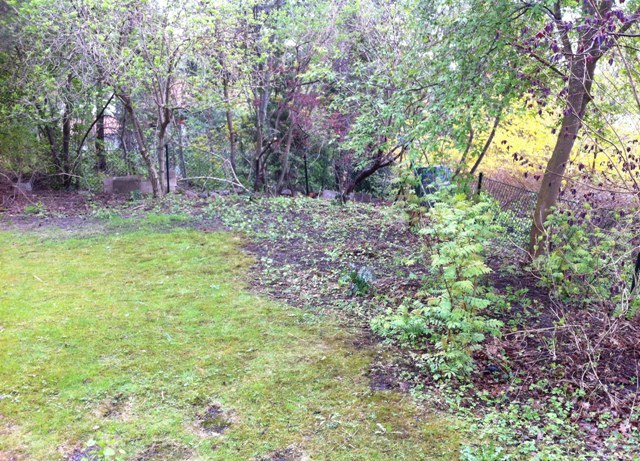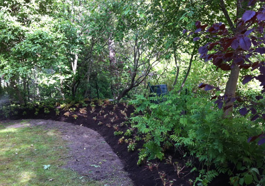 Före och efter en plantering i Täby i maj. Efter bortrensning av ogräs, gallring bland buskar och jordförbättring planterade vi sockblomma, vintergröna, skuggröna och flocknäva i grupper över hela ytan.