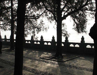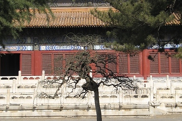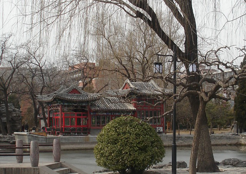 Trädgård kan vara fint även på vintern. Med hjälp av vintergröna växter och träd med vackra siluetter till exempel - som här i en park i Peking i mars.
