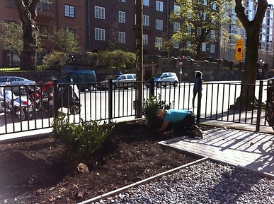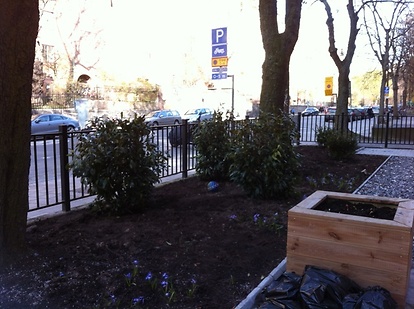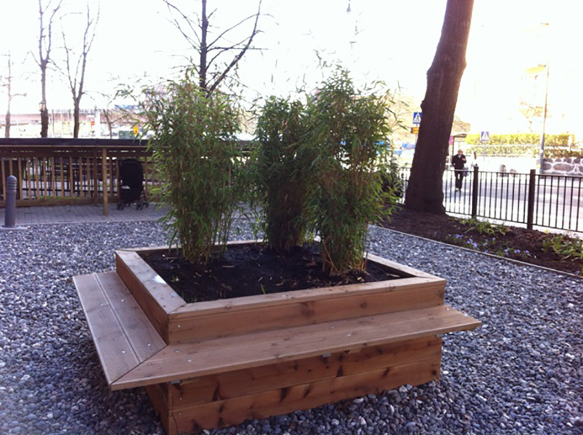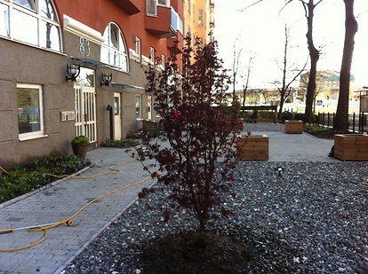 På Karlbergsvägen 83 håller gården mot gatan gradvis på att förändras. Gräs som inte växte i det skuggiga läget har bytts ut mot plattor, ytor med sjösten samt mycket växter - här bambu i stor planteringslåda med sittbänkar. Framför bambuplantorna kommer rödbladiga höstsilverax att växa upp.