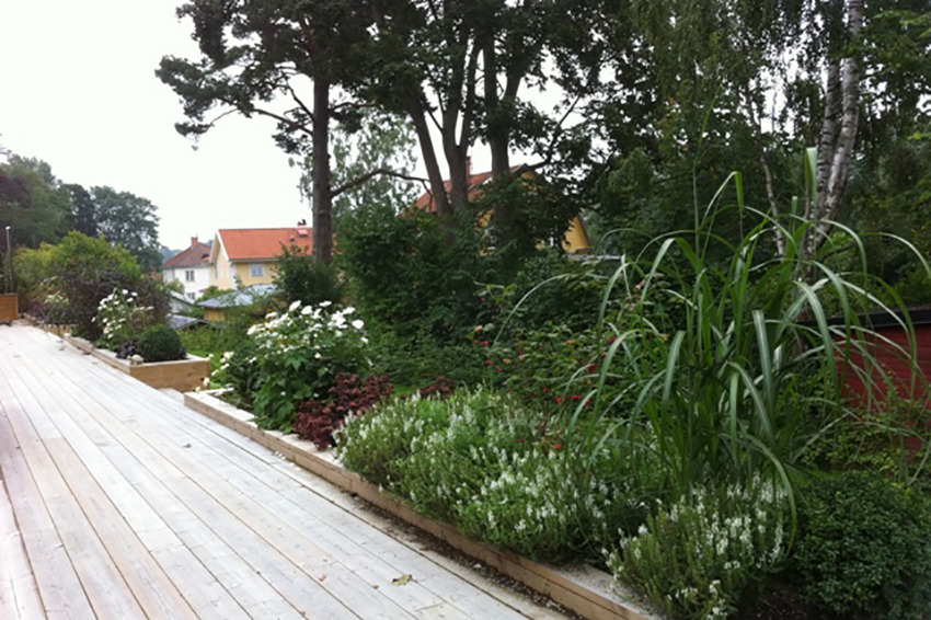 Planteringslådor runt trädäck i Täby. Växterna planterades i maj och så här fint var det redan i augusti! Mycket vatten lönar sig. Buxbom, glansmiskantus, vit stäppsalvia, körsbärsbenved, kärleksört, höstanemon, rudbeckia, alunrot med flera skönheter.